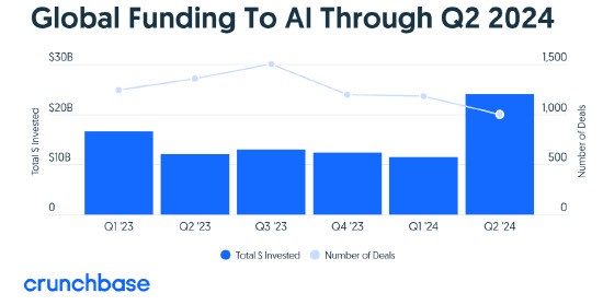 据权威企业数据平台Crunchbase最新发布的报告,今年第二季度,全球AI初创公司迎来了前所未有的融资盛宴,共吸引了高达240亿美元的投资资金,环比飙升一倍以上,彰显出投资者对人工智能领域的浓厚兴趣与高度信心。