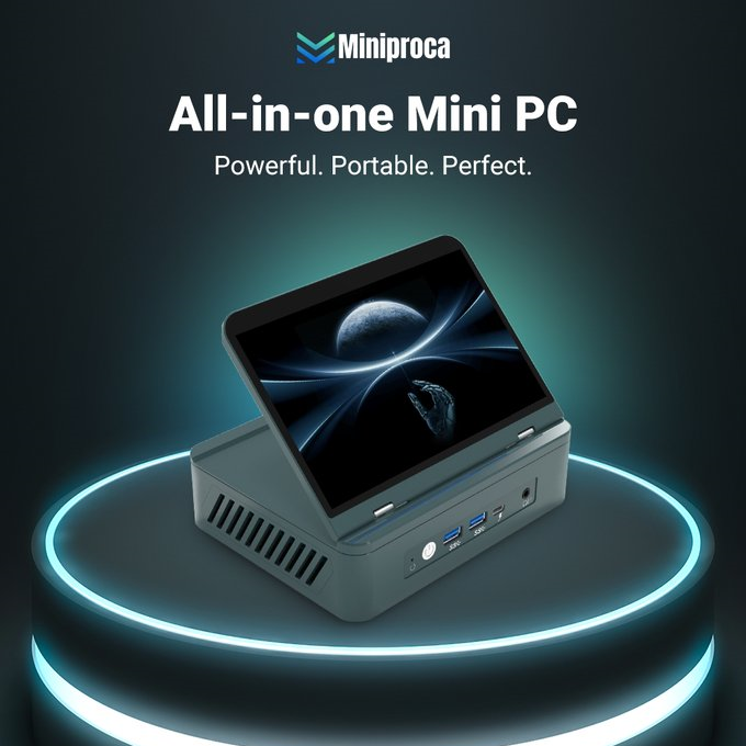 Miniproca是一款新型的带屏迷你主机,近日在众筹平台上亮相。这款主机体积小巧,重量仅为855克,可以方便地放入背包中携带。机身采用铝合金外壳,顶部配备一块支持0~90°开合的7英寸多点触控屏幕。