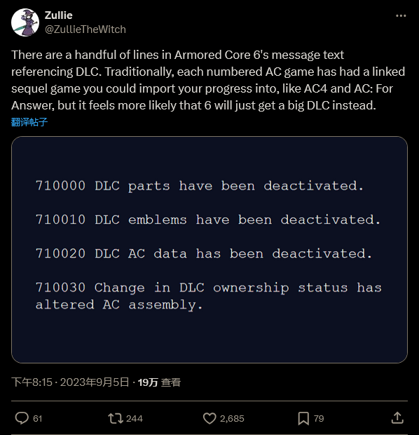 去年9月,一份《装甲核心6》的数据挖掘结果显示游戏的DLC正在开发中。这个消息由魂系社区著名的数据挖掘者Zullie the Witch分享。虽然还不清楚他发现的具体内容,但从最新消息来看,游戏很可能发布DLC,而且这个FromSoftware长期沉寂难得一见的系列也许很快就会有更多的作品。