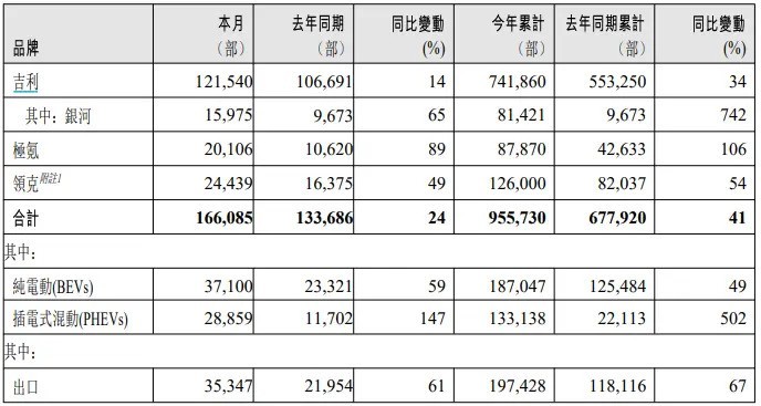 7月1日,吉利汽车控股有限公司发布公告称,集团2024年6月的总销量为166,085辆,相较于去年同期增长约24%。其中,吉利品牌销售了121,540辆,同比增长14%;极氪品牌销售了20,106辆,同比增长89%;领克品牌销售了24,439辆,同比增长49%。