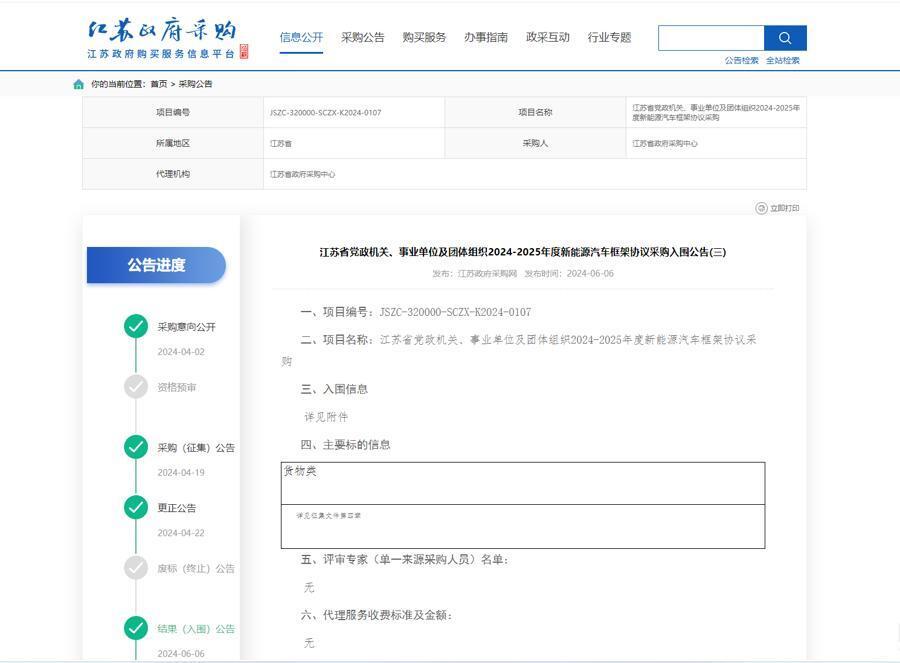 4月2日,江苏省政府采购中心发布2024年4月(第1批)政府采购意向公告;4月19日,进一步发布江苏省党政机关、事业单位及团体组织2024-2025年度新能源汽车框架协议采购征集公告。