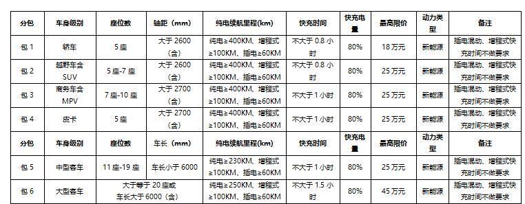 根据框架协议征集公告附件、开放式框架协议采购征集文件第四章采购需求技术要求显示,越野车含SUV的技术要求为:5座-7座,轴距大于2600mm(含),纯电续航里程≥400KM、增程式≥100KM、插电≥60KM,快充时间不大于0.8小时达到快充电量80%。而价格角度,采购最高限价为25万元。