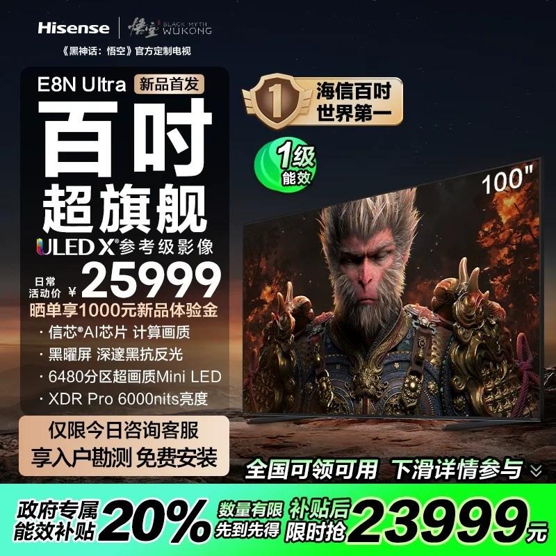 在以旧换新产品类目中,海信与《黑神话:悟空》官方定制电视百吋E8系列,不仅尺寸更大,配置参数也同样拉满。就拿被称为“百吋超旗舰Mini LED”的海信100E8NUltra来说,其搭载的信芯?AI画质芯片堪称电视上的“独立显卡”,能够针对性精细画质调校,实现瞬时精晰控光,即便是最细微的纹理、最复杂的色彩过渡,也能被精准还原。硬件用好料,画质重调校,海信100E8NUltra将画质体验做到了极致,是当之不愧的画质专家。
