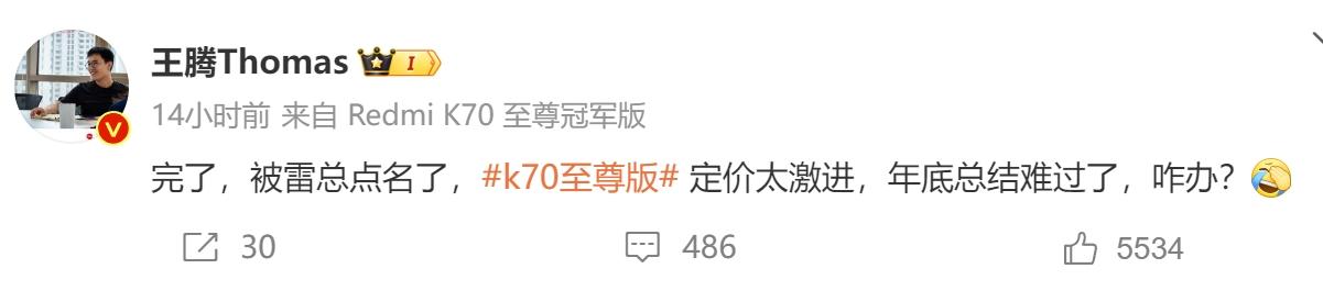 对此,王腾也在微博上进行了回应,称:“完了,被雷总点名了,K70至尊的定价太激进,年底总结难过了。”