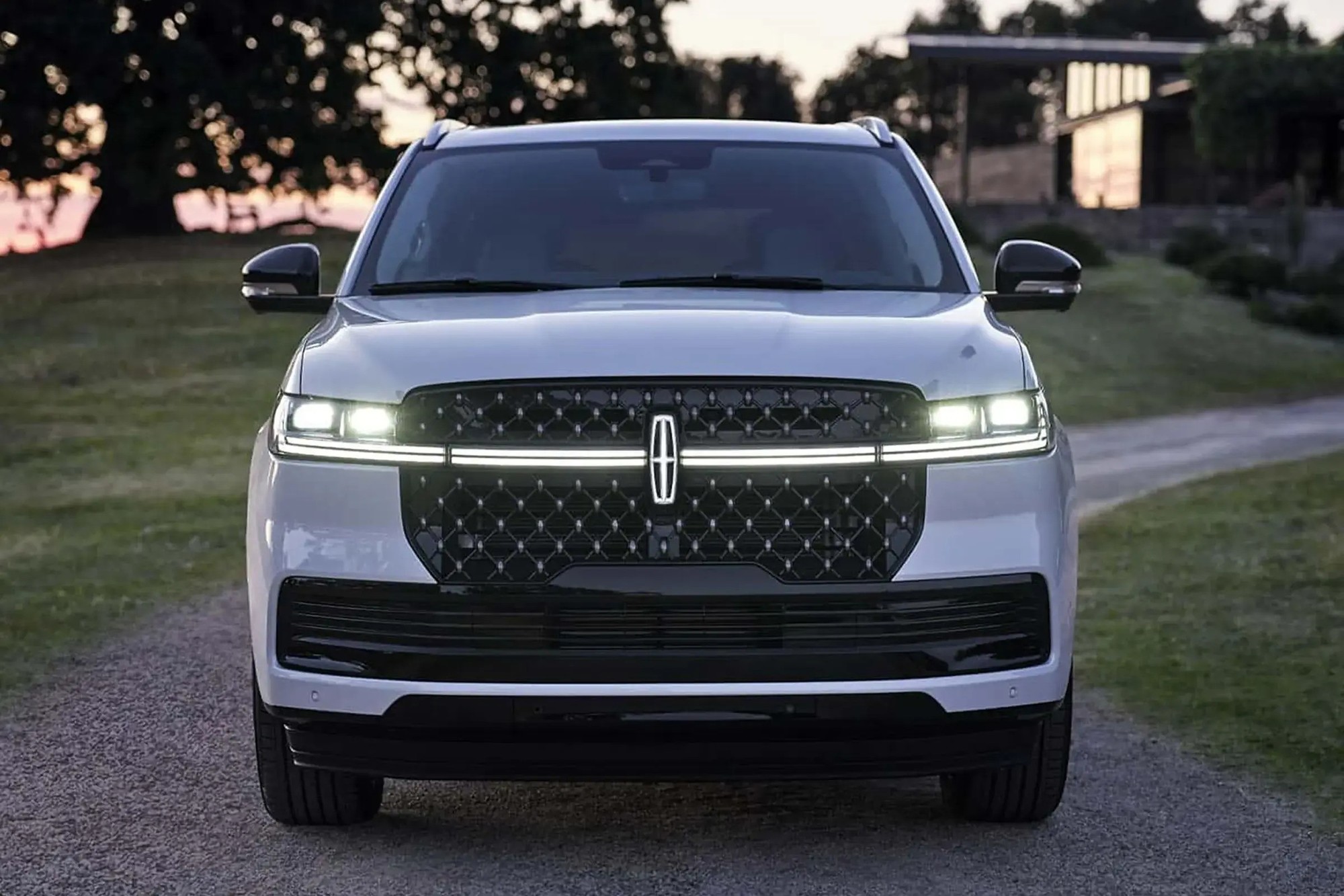在外观方面,全新林肯领航员采用最新的家族式设计风格,中网面积较大,采用点阵状布置,视觉效果不错。LED灯带贯穿整个车头,品牌LOGO还支持发光功能。大灯组内部提供矩阵模组,整体设计辨识度较高,气场也十分强大。