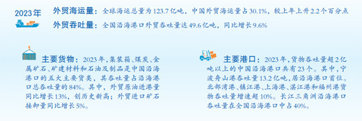 在全球范围内,超八成的国际贸易通过海上运输实现,海运是中国外贸的“大动脉”。《中国港口运行分析报告(2024)》(以下简称《报告》)显示,2023年,在外贸需求回暖、全球贸易体系重塑等因素推动下,中国外贸海运规模增长较快,全国沿海港口外贸吞吐量达49.6亿吨,同比增长9.6%。