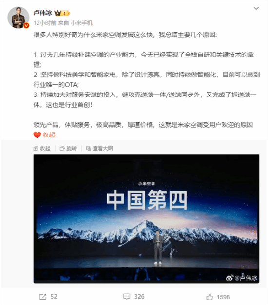 近日,小米集团CMO许斐在谈到小米空调业务时表示,目前在全国市场排名第四,并计划尽快进入前三名。很多人对小米空调的快速发展感到好奇,小米总裁卢伟冰总结了几个主要原因。