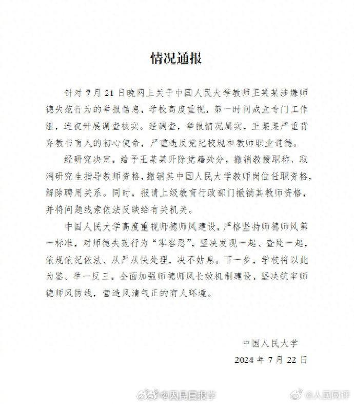 “经调查,举报情况属实”!7月22日,中国人民大学发布情况通报称,经研究决定,给予王某某开除党籍处分,撤销教授职称,取消研究生指导教师资格。此前,王某某被举报涉嫌师德失范行为。