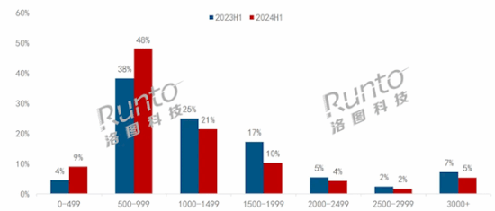 在这个价位段中,灵蛇品牌凭借其低价策略成功抢占了超过40%的市场份额。与此同时,在500-999元的价格区间也显示出强劲的增长势头,上半年市场份额达到48%,比去年同期增加了10个百分点。这主要得益于国内品牌KTC、SANC、科睿在价格竞争中的优势和销售增长所带来。
