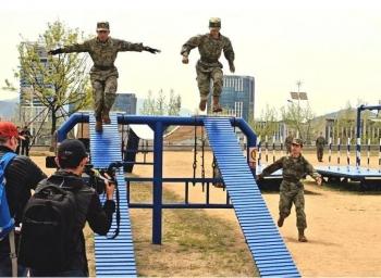 在海军潜艇学院,有台湾媒体注意到有学员示范渡海登岛四百米十项障碍训练与手旗操作。对此,教官表示,这是正常的体能训练项目之一,训练是为了提高学员的身体素质和综合能力,培养顽强的战斗作风,“我们不针对任何目标”。