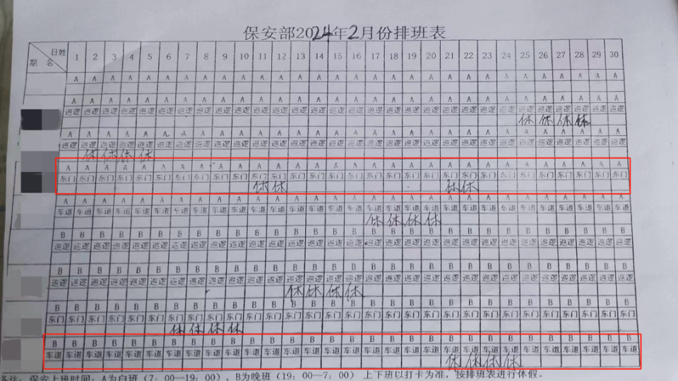 保安部2024年2月排班表,上面方框是陈淑芬的排班,下面是丈夫刘建华的排班 /受访者供图
