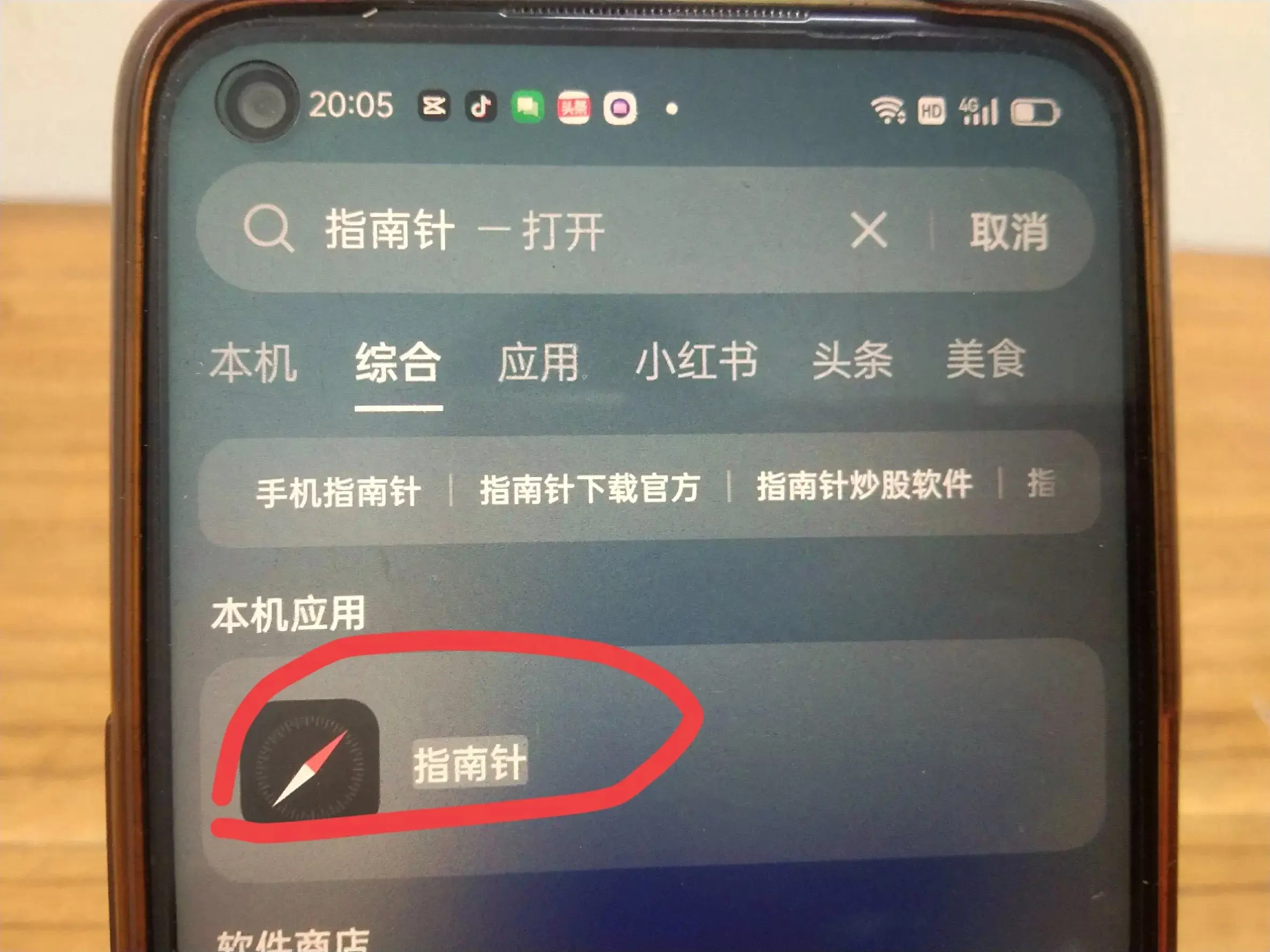输入之后,它就会显示本机应用,这里就有一个指南针,我们点进去(如上图所示)