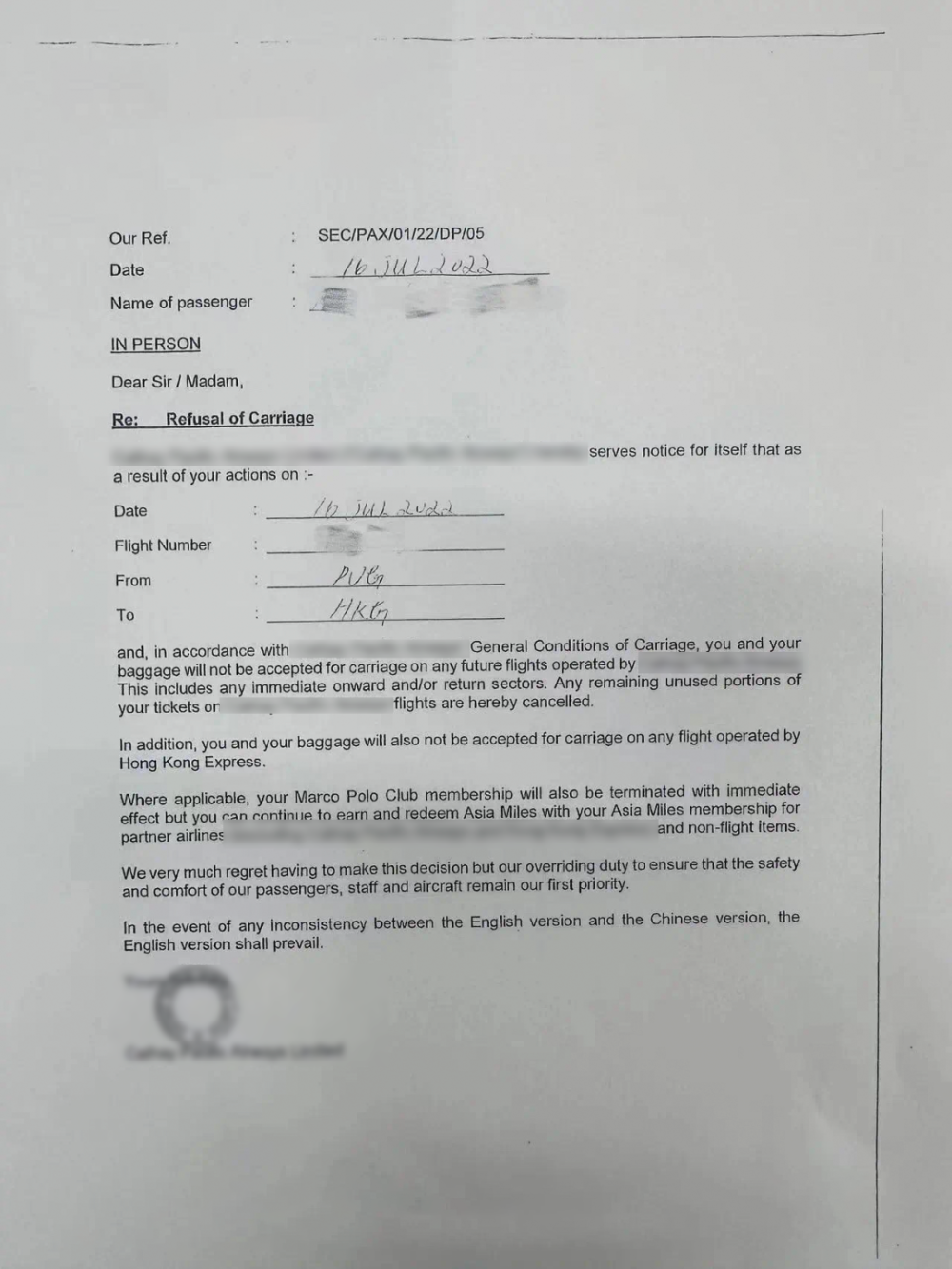 在等待办理改签航班值机时,航空公司的工作人员向夏女士面交了一份《拒绝运输通知》,说明公司拒绝夏女士登机以及运载她的行李,而且以后也将拒绝她搭乘该航空公司运营的所有航班。