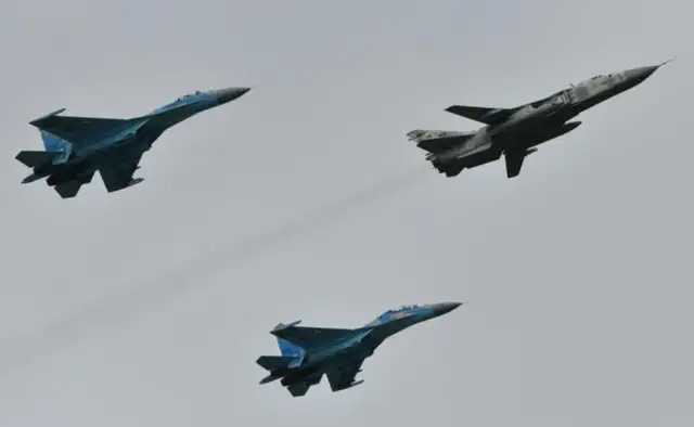 上图为2018 年10月,乌克兰空军举行演习,两架 SU-27 战机护送一架 SU-24 前线轰炸机。