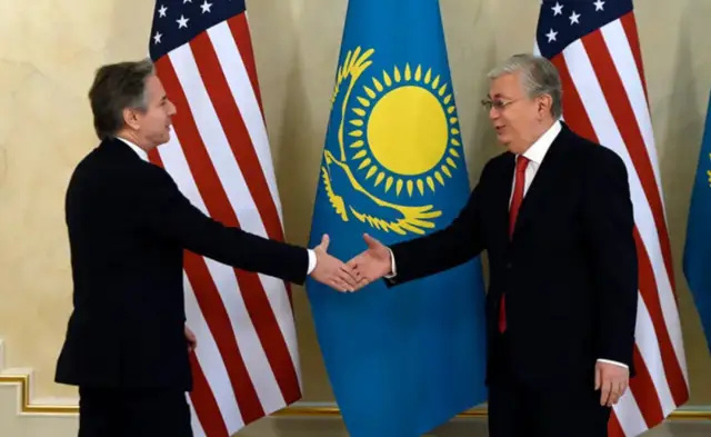 “商业内幕”特地提供了一张配图,2023 年2 月,美国国务卿布林肯访问阿斯塔纳会见哈萨克斯坦总统托卡耶夫。