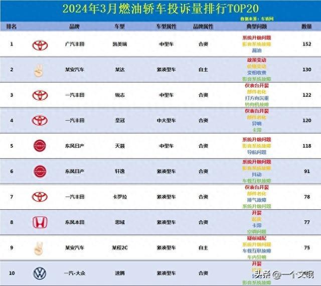 根据2024年3月燃油轿车投诉量排行榜前十名的数据来看,8款合资车型和两款国产车型位列其中。丰田品牌共有4款车型入选前10名,而日产和某安各占2款。此外,本田、大众以及别克、林肯等品牌的各一款车型也跻身前10之列。
