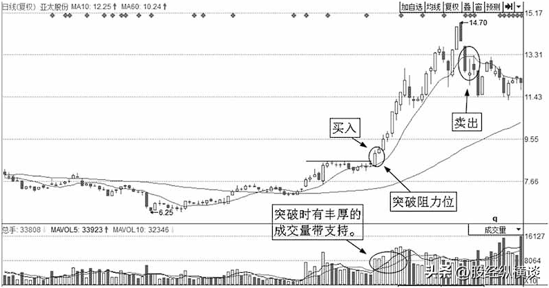 如图1-1所示,亚太股份(002284)在图中箭头处以一根大阳线一举突破前期调整小平台,且站上10日均线,意味着短线上行空间被打开,可看高一线。突破时成交量较前期明显放大,这也是一个支持股价走高的有利条件,该股有较强的上涨欲望,投资者可买入。当股价跌破10日均线,果断出局寻找其他个股机会。