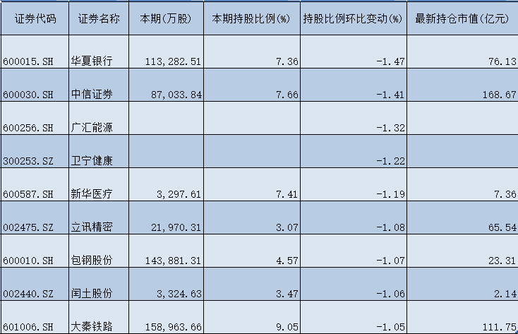 此外,国家队一季度对广汇能源(600256)、卫宁健康(300253)、新华医疗(600587)、立讯精密(002475)、包钢股份(600010)、润土股份(002440)、大秦铁路(601006)等个股的持股比例,环比降幅均超过1%,分别减少了1.32%、1.22%、1.19%、1.08%、1.07%、1.06%和1.05%。
