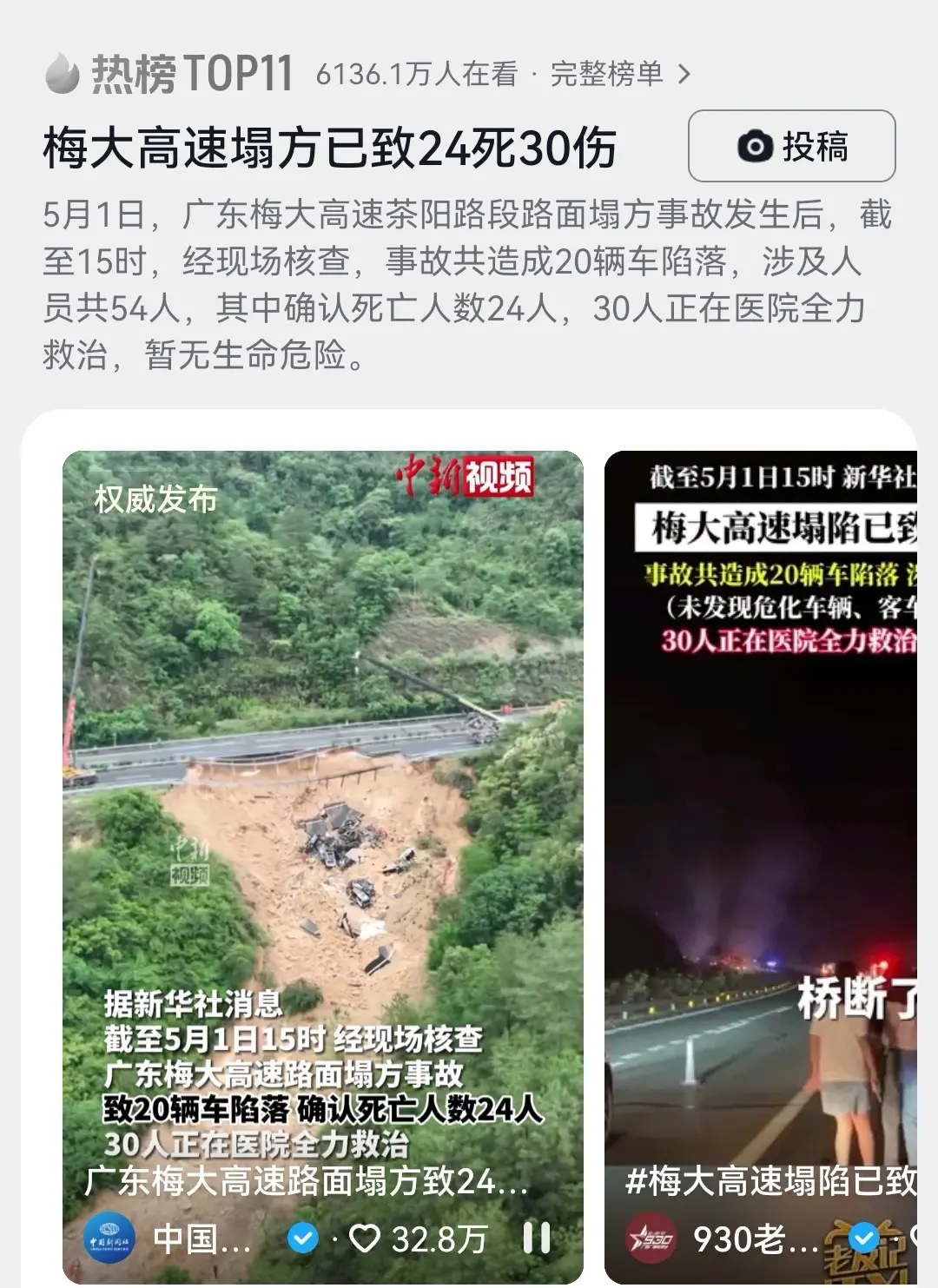 5月小长假才开始第一天,就当全国人民沉浸在假日的欢乐中时,不幸的消息传来,广州梅州高速发生塌方事故,已有多人伤亡。