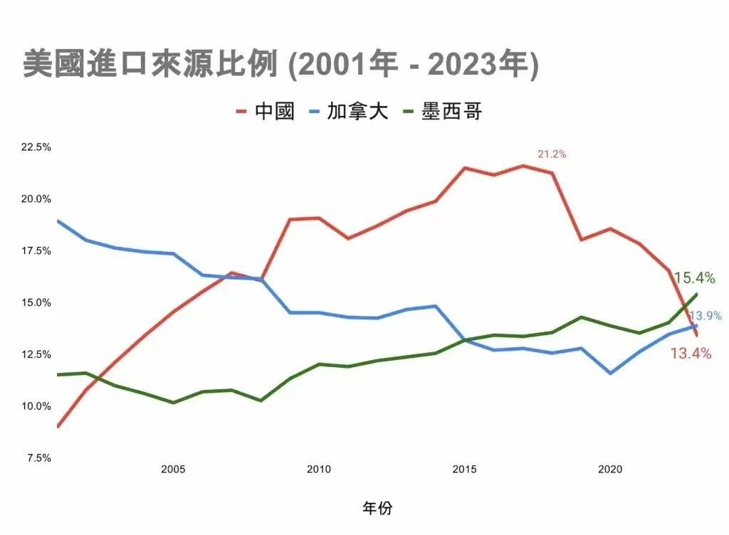 美国官方还公布了一则数据,去年美国从墨西哥的进口额达到4750亿美元,反超中国,墨西哥成为了美国的第一大进口国,而且从加拿大的进口额也反超了我国,我国跌至美国第三大进口国地位。