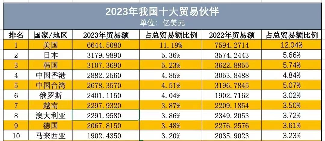 看完这些数据,可以发现美国依然是我国最大的贸易国,日本、韩国位居第二和第三,但是我国与日韩的贸易额为3000亿美元以上,而与美国的贸易额高达6600多亿美元,显然不是一个量级。