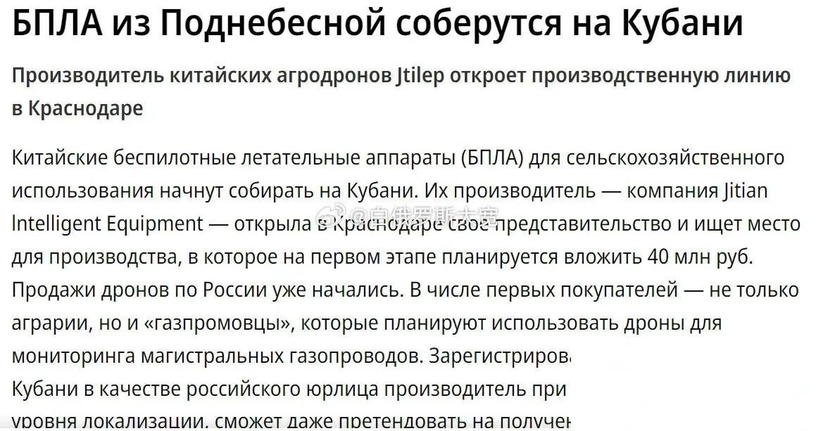 而Jtilep公司的投资建设工厂,不仅能够规避中国对无人机出口的限制,还能够满足俄罗斯市场对农业无人机的需求,可以说是一举两得。