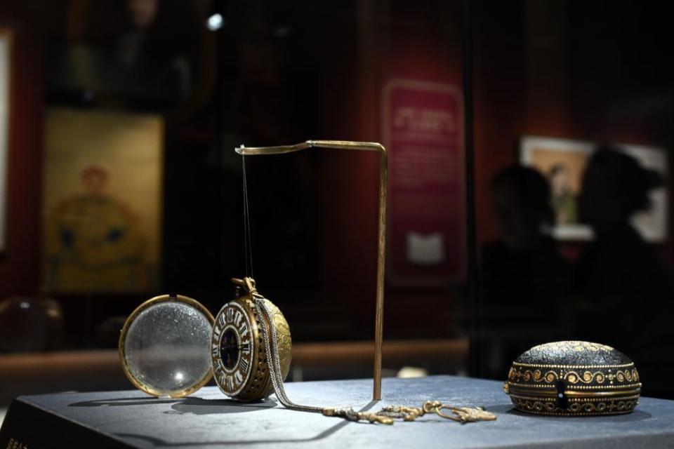 这是展出的故宫博物院藏铜镀金壳开光人物像怀表。2024年4月1日,作为中法文化旅游年的重要项目,“紫禁城与凡尔赛宫——17、18世纪的中法交往”展览开幕式在北京故宫文华殿举行,展出大约200件文物精品。(新华社记者金良快摄)