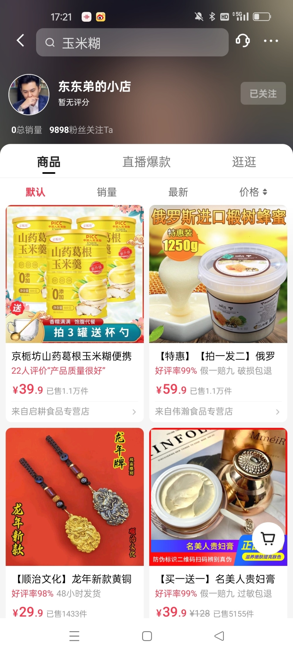 某短视频平台上,以“靳东”口吻发布视频的账号开了小店,里面有很多商品。网络截图