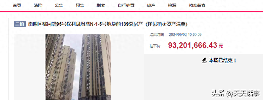 5月2日,虽然五一假期,很多人都出门旅游了。不过在贵阳市司法拍卖市场上,还是迎来了一宗重量级法拍的最后一天竞拍。位于贵阳市南明区桃园路95号保利凤凰湾N-1-5号地块的139套房产第二次被拍卖,起拍价9320.1666万元。最终拍卖只有一个人报名竞拍,以起拍价就拍下了这139套房产。