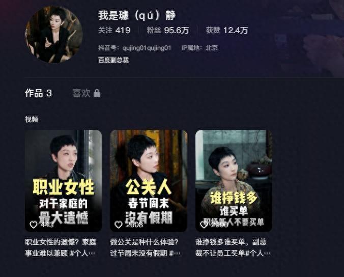 近期,一个简介为百度副总裁璩静的账号开始发布视频,分享职场经历和思考。一条视频中,她用辛辣的语气提到“员工闹分手提离职我秒批”,表示和员工只是雇佣关系,没有义务去了解其个人情况,为什么要考虑员工家庭,引发网友热议。