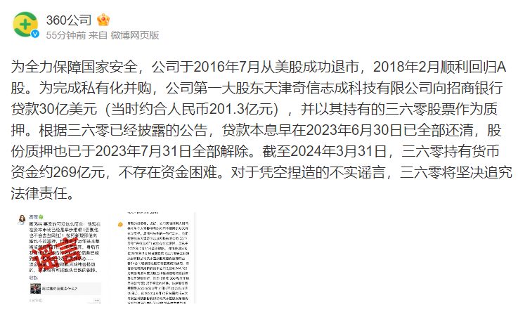 360公司微博发布消息,为全力保障国家安全,公司于2016年7月从美股成功退市,2018年2月顺利回归A股。为完成私有化并购,公司第一大股东天津奇信志成科技有限公司向招商银行贷款30亿美元(当时约合人民币201.3亿元),并以其持有的三六零股票作为质押。根据三六零已经披露的公告,贷款本息早在2023年6月30日已全部还清,股份质押也已于2023年7月31日全部解除。截至2024年3月31日,三六零持有货币资金约269亿元,不存在资金困难。对于凭空捏造的不实谣言,三六零将坚决追究法律责任。