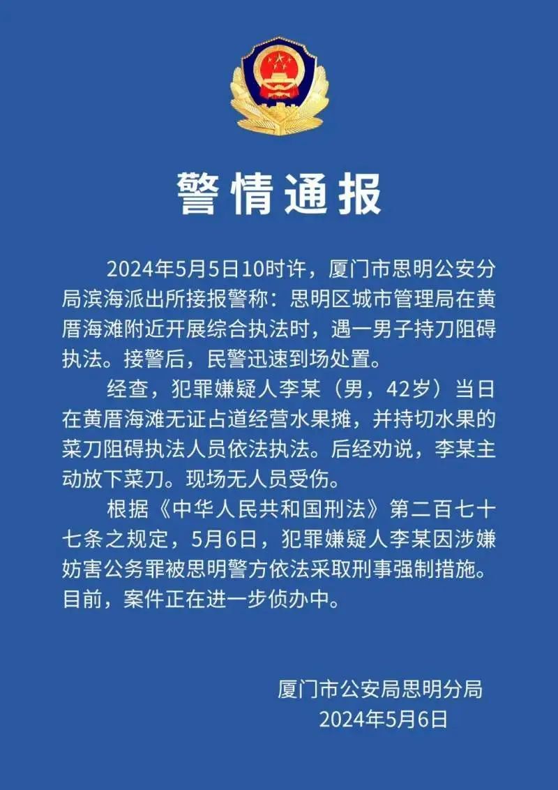 通报称,5月5日10时许,厦门市思明公安分局滨海派出所接报警称,思明区城市管理局在黄厝海滩附近开展综合执法时,遇一男子持刀阻碍执法。