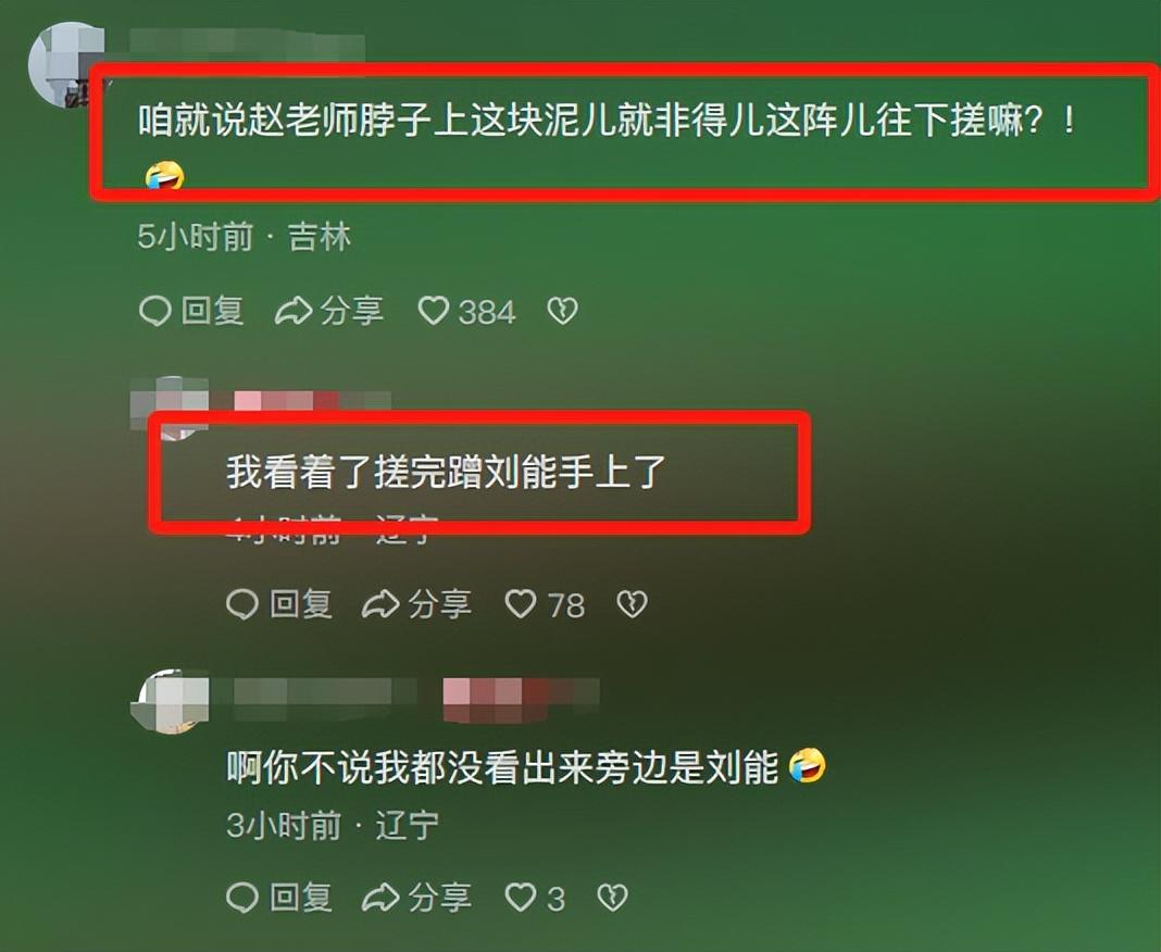 有眼尖的网友看到,赵本山搓下泥后两根手指在椅子扶手旁边蹭掉了,似乎是抹到了王小利手上,这画面的爆笑程度堪比春晚小品桥段,又是怀念赵本山统治春晚小品区的一天呀。