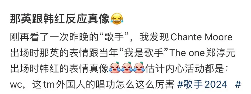 不难看出本次歌手两位外国参赛者实力有多强大。她们的出色发挥与内娱形成了鲜明对比,也因此被网友调侃歌手现场为“长沙格莱美”。