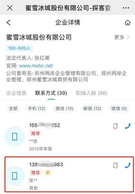 每经记者从“中国上市公司品牌价值榜”中随机挑选了部分知名上市公司,又补充了一些未上市的知名企业,在探客查上简单搜索,就发现了十位知名企业家的手机号在售,分别是:农夫山泉创始人钟睒睒、牧原股份实控人钱瑛、森马服饰创始人邱光和、荣盛集团董事长李水荣、蓝思科技董事长周群飞、新尚集团董事长唐立新、蜜雪冰城实控人张红甫、钟薛高创始人林盛、喜茶创始人聂云宸、蔚来汽车联合创始人秦力洪(为保护个人隐私,本文将展示的手机号打码)。