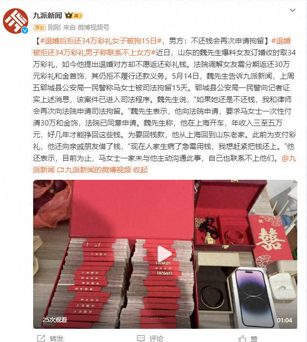 近日,山东的魏先生爆料女友订婚收时取34万彩礼,如今他提出退婚对方却不愿返还彩礼钱。法院调解女友需分期返还30万元彩礼和金首饰,其仍拒不履行还款义务。5月14日,魏先生告诉九派新闻,上周五郓城县公安局一民警称马女士被司法拘留15天。郓城县公安局一民警向记者证实上述消息,该案件已进入司法程序。魏先生说,“如果她还是不还钱,我和律师会再次向法院申请司法拘留。”魏先生表示,他向法院申请,要求马女士一次性付清30万和金饰,法院已同意申请。魏先生称,他在上海开车,年收入三至五万元,好几年才能挣回这些钱。为要回钱款,他从上海回到山东老家。此前为支付彩礼,他还向亲戚朋友借了钱,“现在人家生病了急需用钱,我想赶紧把钱还上。”他还表示,目前为止,马女士一家未与他主动沟通此事,自己也联系不上他们。