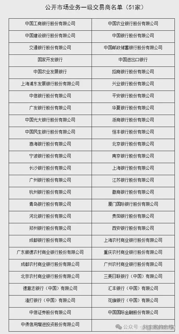 比方说,中国人民银行公布最新的2023年一级交易商有51家。