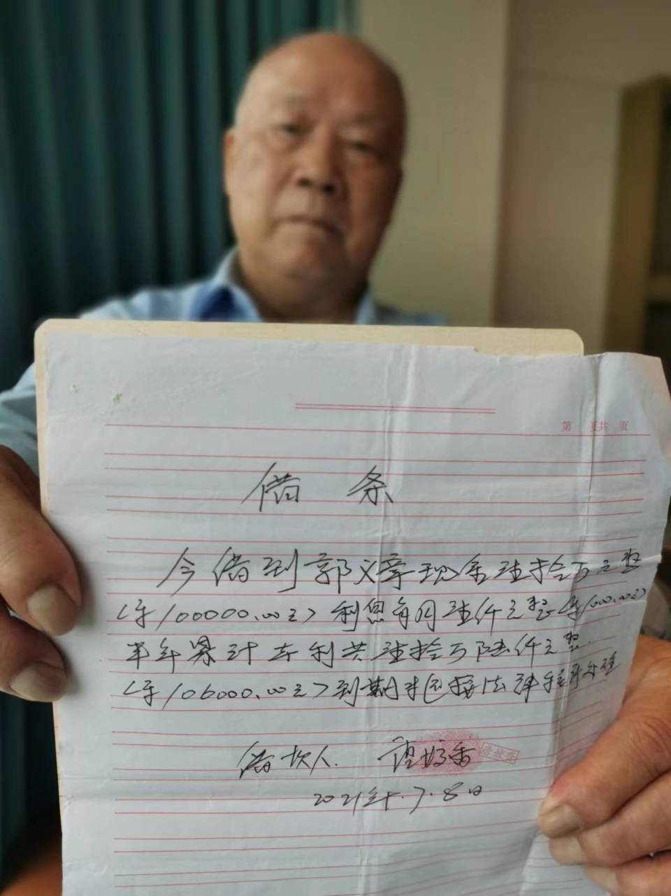 “我当时觉得很稳了。她不可能在法律面前耍赖嘛。”郭义章说,后来他儿子也跟着借给唐姣香10万元。