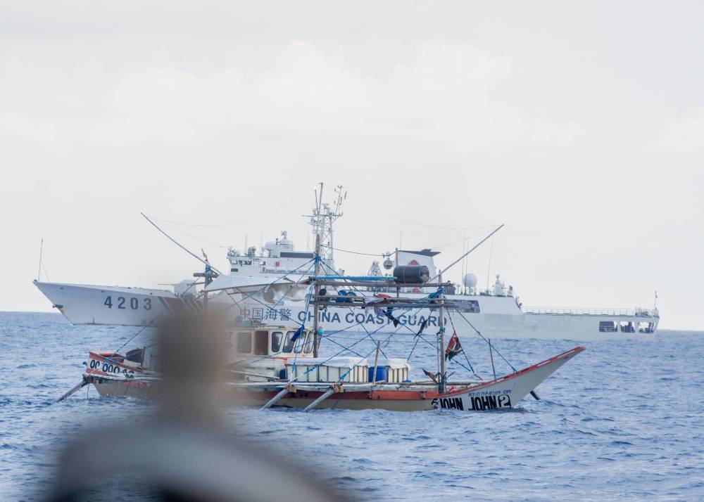 5月16日,菲律宾多艘船只在我黄岩岛邻近海域非法聚集,开展与正常渔业生产作业无关的活动,中国海警加强现场监视取证/澎湃影像