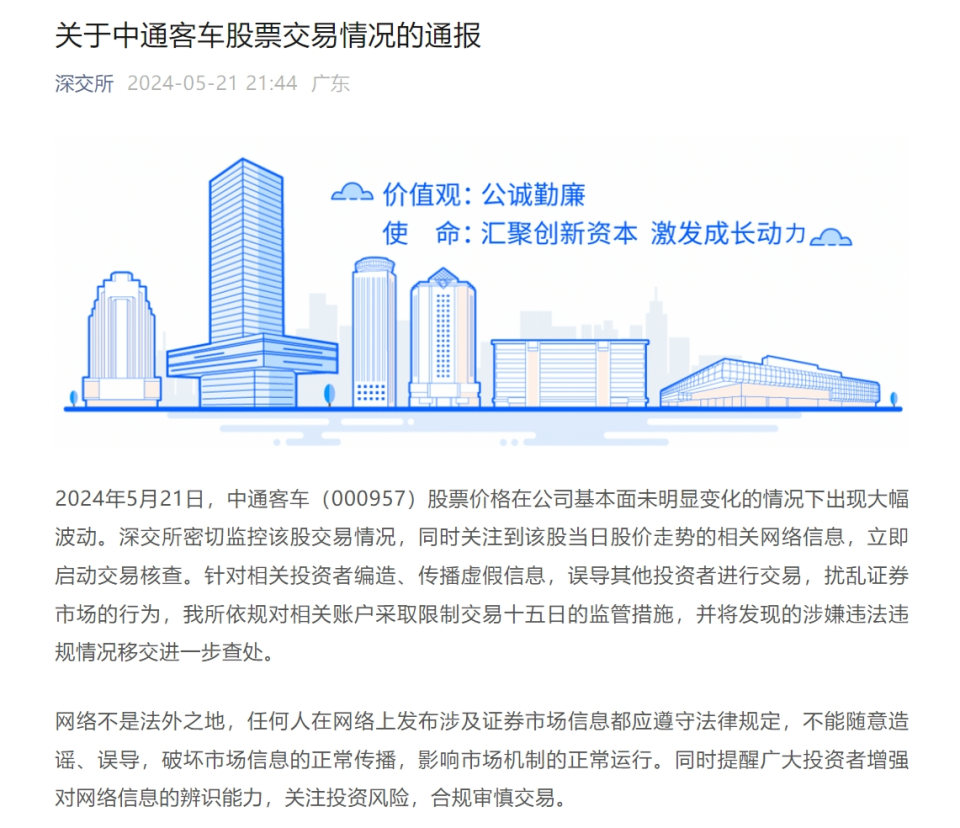 5月21日晚,深交所发布通报称,2024年5月21日,中通客车(000957)股票价格在公司基本面未明显变化的情况下出现大幅波动。深交所密切监控该股交易情况,同时关注到该股当日股价走势的相关网络信息,立即启动交易核查。针对相关投资者编造、传播虚假信息,误导其他投资者进行交易,扰乱证券市场的行为,我所依规对相关账户采取限制交易十五日的监管措施,并将发现的涉嫌违法违规情况移交进一步查处。网络不是法外之地,任何人在网络上发布涉及证券市场信息都应遵守法律规定,不能随意造谣、误导,破坏市场信息的正常传播,影响市场机制的正常运行。同时提醒广大投资者增强对网络信息的辨识能力,关注投资风险,合规审慎交易。