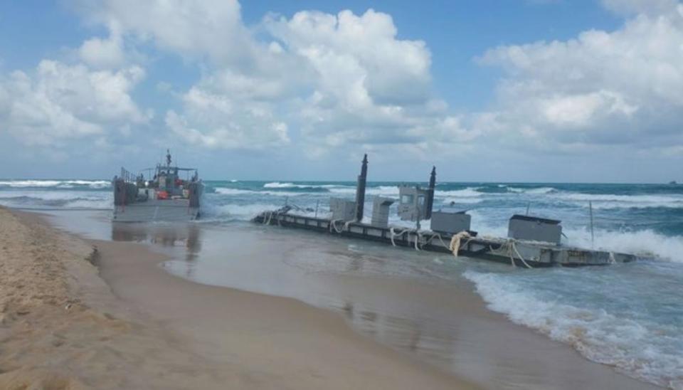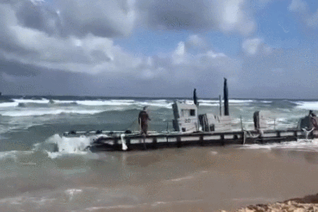 以色列第12频道5月25日报道称,在强烈风浪的冲击下,这处临时码头当天有部分结构脱落并漂入海中,美军人员随后将其拖回并重新进行了固定。