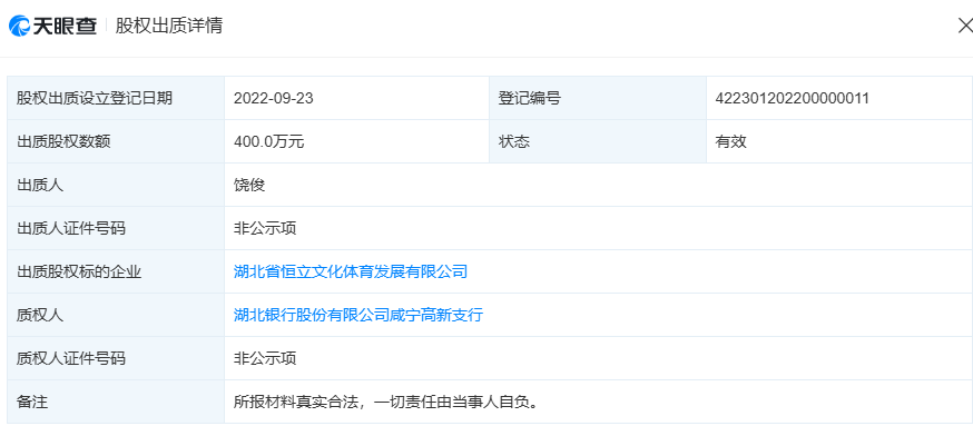 其中,饶俊在恒立文化体育发展有股权出质信息,出质股权数额为400万元,质权人为湖北银行股份有限公司咸宁高新支行,股权出质设立登记日期为2022年9月23日,目前仍有效。