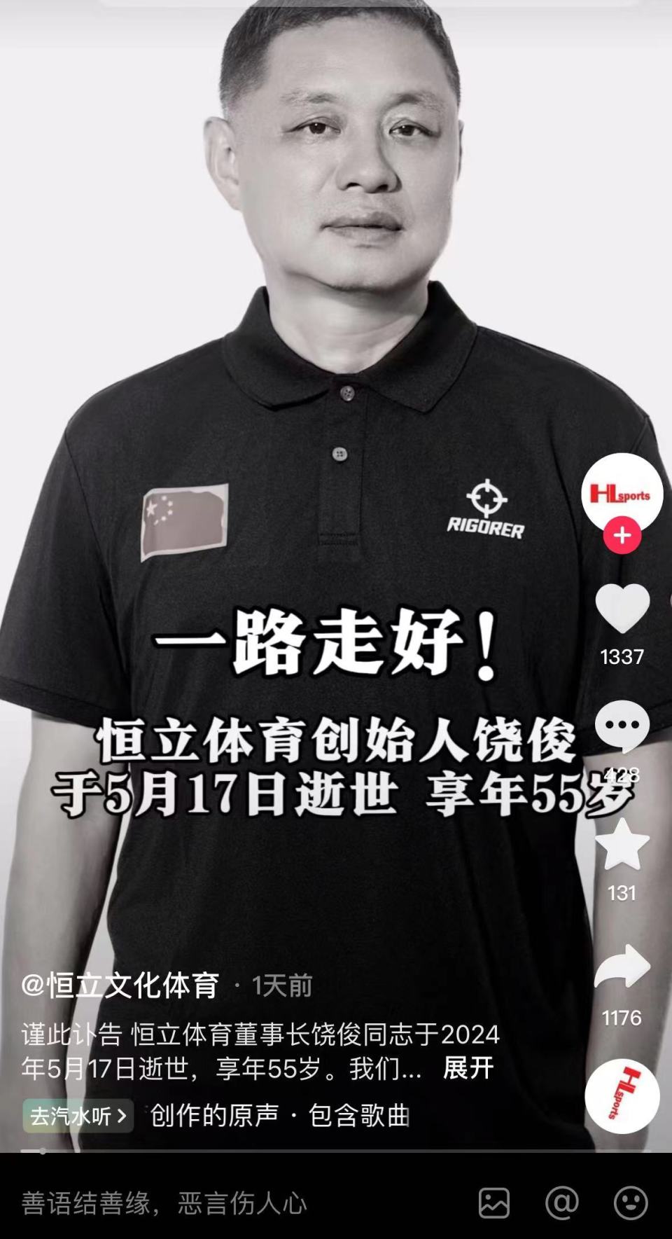 红星资本局5月27日消息,5月26日,恒立文化体育官方账号对外发布讣告,恒立体育董事长饶俊于2024年5月17日逝世,享年55岁。不过,对于饶俊突然去世的原因,恒立文化体育并未说明。