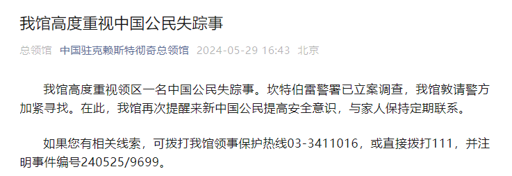如果您有相关线索,可拨打我馆领事保护热线03-3411016,或直接拨打111,并注明事件编号240525/9699。