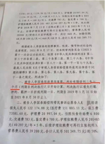 民事赔偿部分,法院判决李国春赔偿蔡杰经济损失25万余元。宋淑梅说,截至目前,他们已赔付约13万,还剩12万余元。被害人保留了后续护理费五年一诉的权利,“这次又起诉我们后五年的护理费,11万多。”