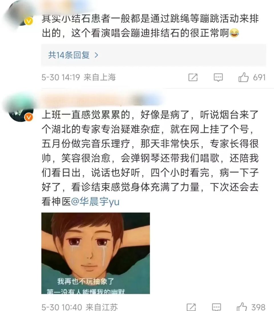 该网友在文中称,自己的对象肾结石并不严重,当天喝了很多水,一直蹦蹦跳跳。在听演唱会时,对象突然表示“肾结石好像被震碎了,好通透”,回酒店后,其居然真的排出了黄色颗粒物。
