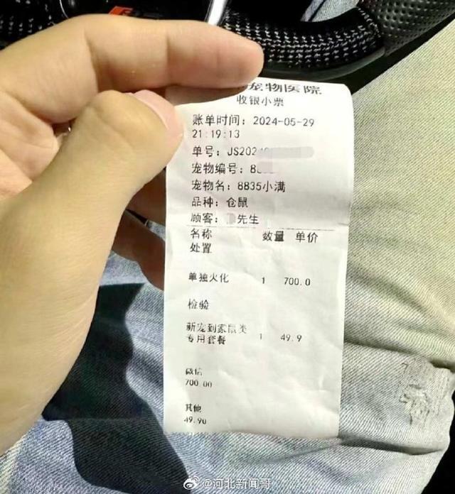 近日,西安网友孙先生(化名)在社交平台发帖表示,他的车友群里有人晒出一张某宠物医院的小票,显示宠物小仓鼠死亡后的单独火化费用为700元,引发网友讨论。