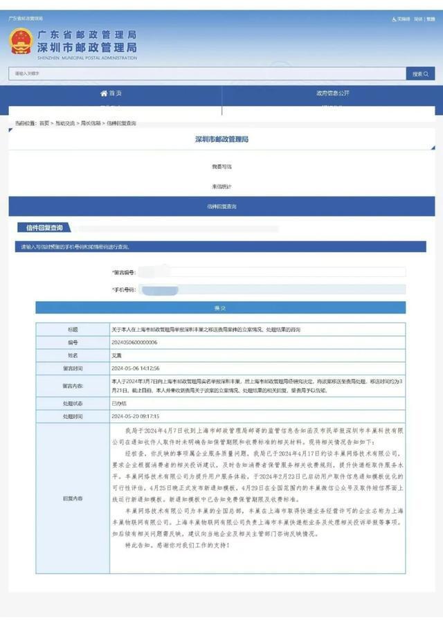 “4月29日在全国范围内的丰巢微信公众号及取件短信界面上线运行新通知模块。新通知模块中已告知免费保管期限及收费标准。”日前,上海大学法学院在读研究生艾震收到了深圳市邮政管理局就丰巢在通知收件人取件时未明确告知管理期限和收费标准问题的回应。