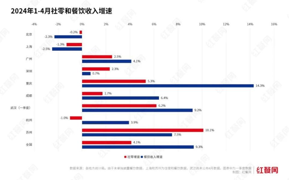 相较于北上的负增长,广深则陷入了低迷不振的状态。1-4月的餐饮收入增速分别为4.1%和0.7%,低于全国9.3%增速,与其他城市相比也处于较低的水平。