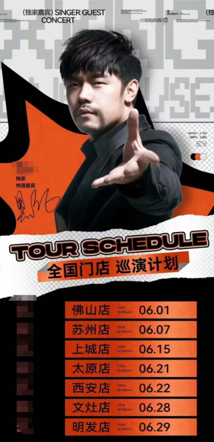 按照相关宣传海报,“黑伦”巡演的足迹遍布佛山(6月1日)、苏州(6月7日)、杭州(6月15日)、太原(6月21日)、西安(6月22日)和厦门(6月28日、29日),几乎每个周末都在演出,比周杰伦本人都还忙。